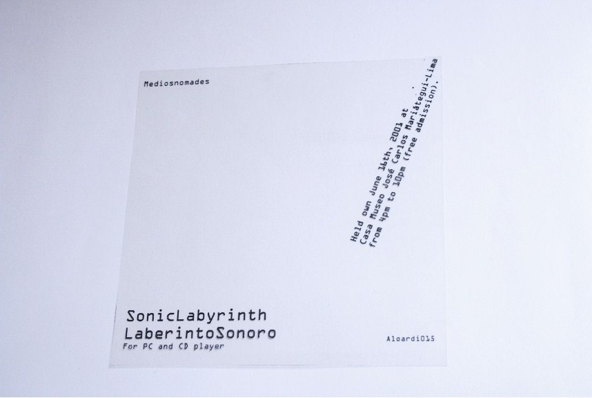 Esta publicación contiene informacion, fotos, registro en video y audio de «Laberinto Sonoro» una Intervención sonora concebida por Christian Galarreta y Sun Cok en la que participaron diversos artistas. El Audio de esta publicación es el resultado de la libre mezcla hecha por el publico de las performances realizadas en vivo y simultáneamente por los artistas invitados. El evento fue organizado por Medios Nómades (Sun Cok), Aloardi (Galarreta) y los artistas participantes (ver abajo). Se realizó el 16 de junio del 2001 en la casa museo «Jose Carlos Mareategui», se contó con este espacio gracias a la gestión de la artista y curadora Angie Bonino . Este CD-Rom fue publicado por Aloardi y producido en colaboración con Medios Nomades. Se contó con el apoyo de ATA y Angie Bonio para la edición del video.